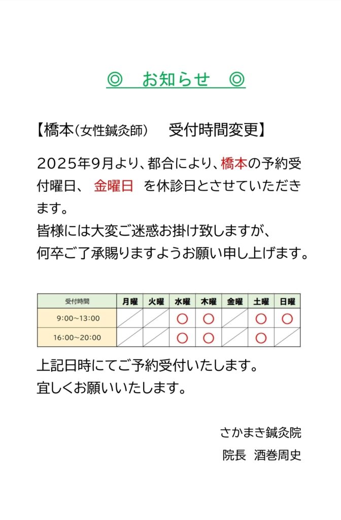 2025年8月24日 / 最終更新日時 : 2025年8月24日 wpuser お知らせ 橋本(女性鍼灸師)予約受付曜日について Follow me! コメントを残す コメントをキャンセルメールアドレスが公開されることはありません。 ※ が付いている欄は必須項目ですコメント ※ 名前 ※ メール ※ サイト 次回のコメントで使用するためブラウザーに自分の名前、メールアドレス、サイトを保存する。 上に表示された文字を入力してください。