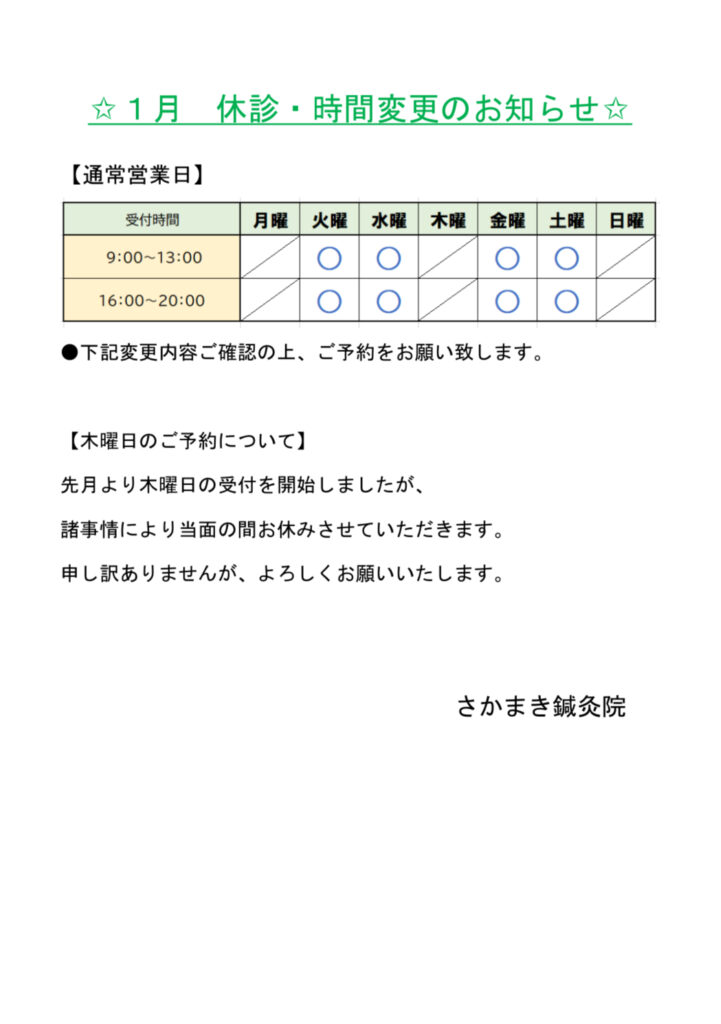 1月の休診・時間変更のお知らせ