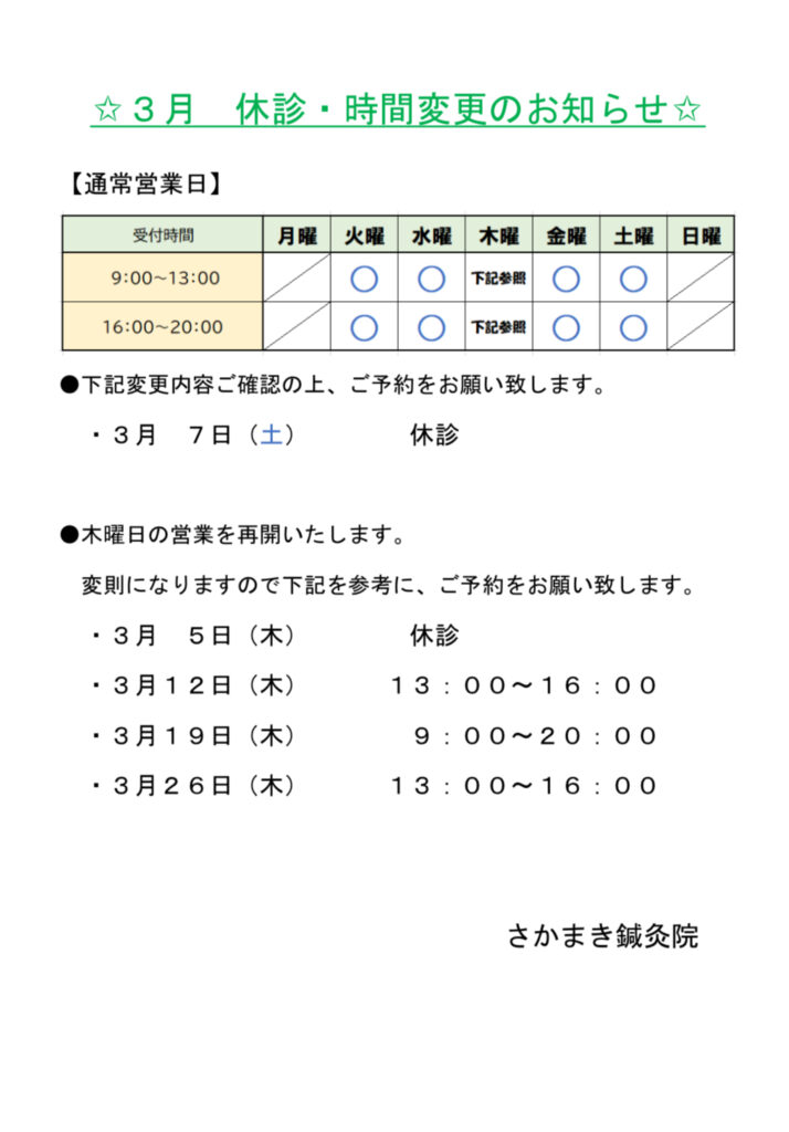 2026年2月12日 / 最終更新日時 : 2026年2月12日 wpuser お知らせ 3月の休診・時間変更のお知らせ Follow me! コメントを残す コメントをキャンセルメールアドレスが公開されることはありません。 ※ が付いている欄は必須項目ですコメント ※ 名前 ※ メール ※ サイト 次回のコメントで使用するためブラウザーに自分の名前、メールアドレス、サイトを保存する。 上に表示された文字を入力してください。